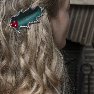 Accessoire cheveux en satin de soie et viscose vert Houx et strass Double Bonheur