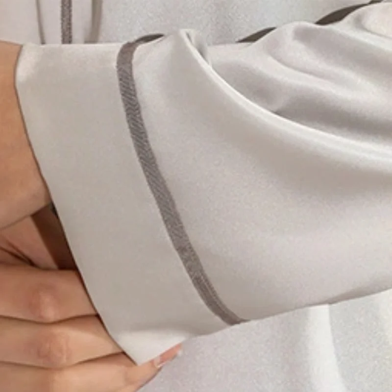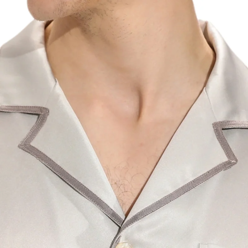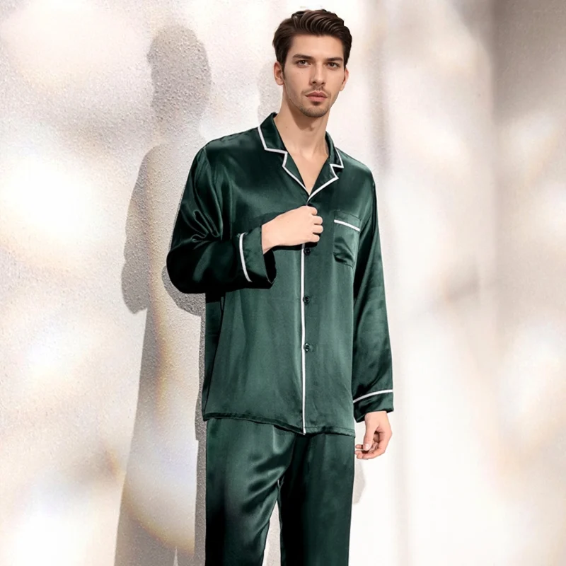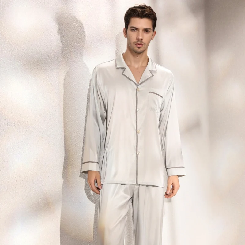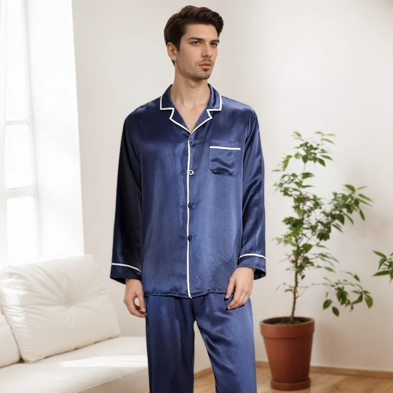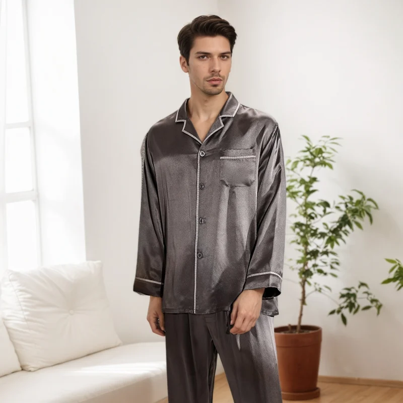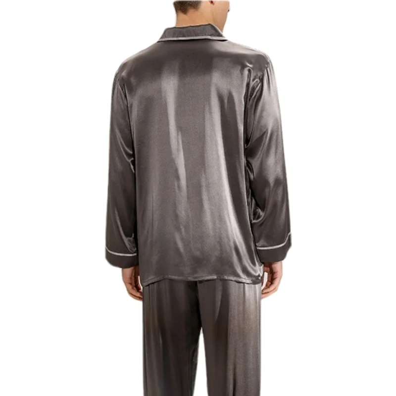 This men’s 100% mulberry silk pajama set, 19 Momme, perfect for loungewear. Features a crisp spread collar with distinct topstitching, long sleeves, full-length pants, and a front button placket. Available in 6 colors, the silk feels luxuriously smooth, offering breathable comfort. A blend of style and functionality, ideal for relaxed evenings at home.