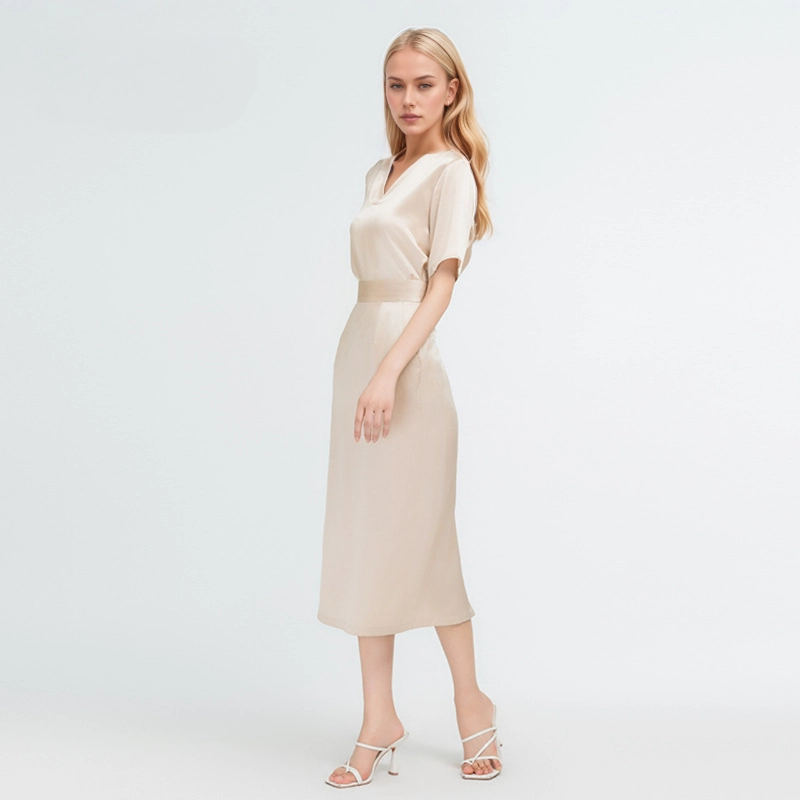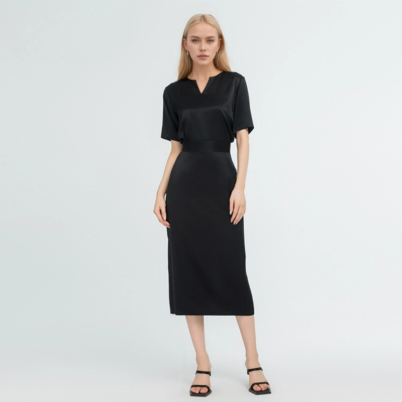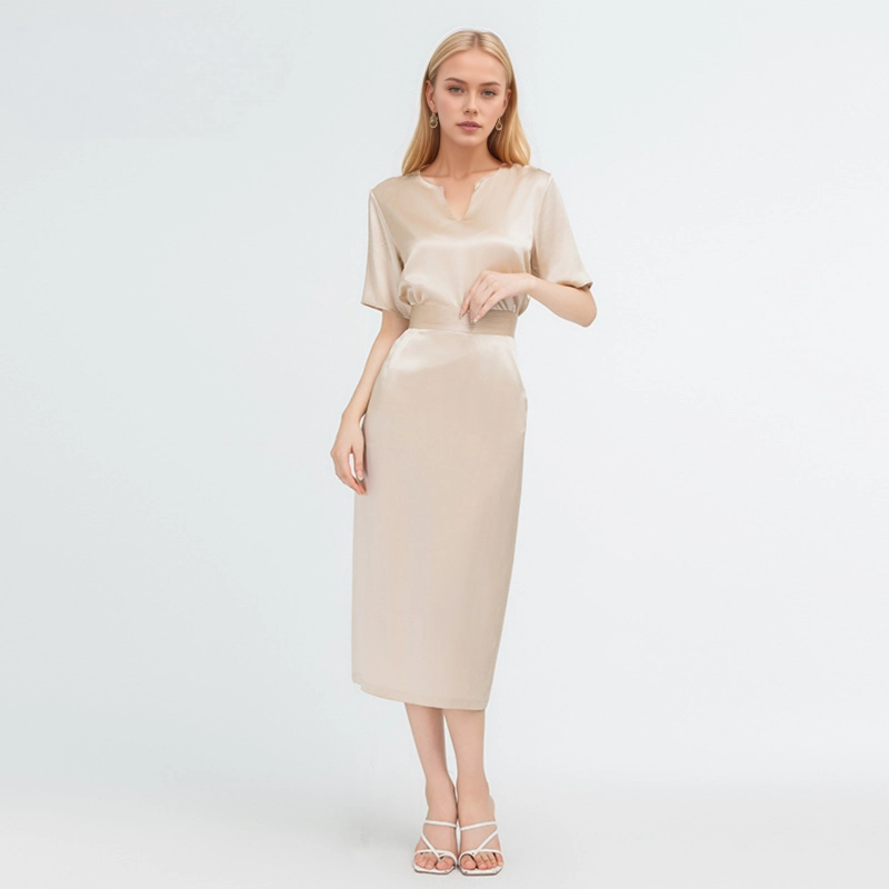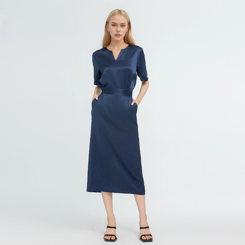 This 100% silk set includes a top and a skirt, crafted with 22 momme silk. The top features a chic V – neck and short sleeves, offering a comfortable fit. The skirt has a waist – defining belt and practical pockets. Soft, smooth, and breathable, it brings a touch of luxury to daily wear.