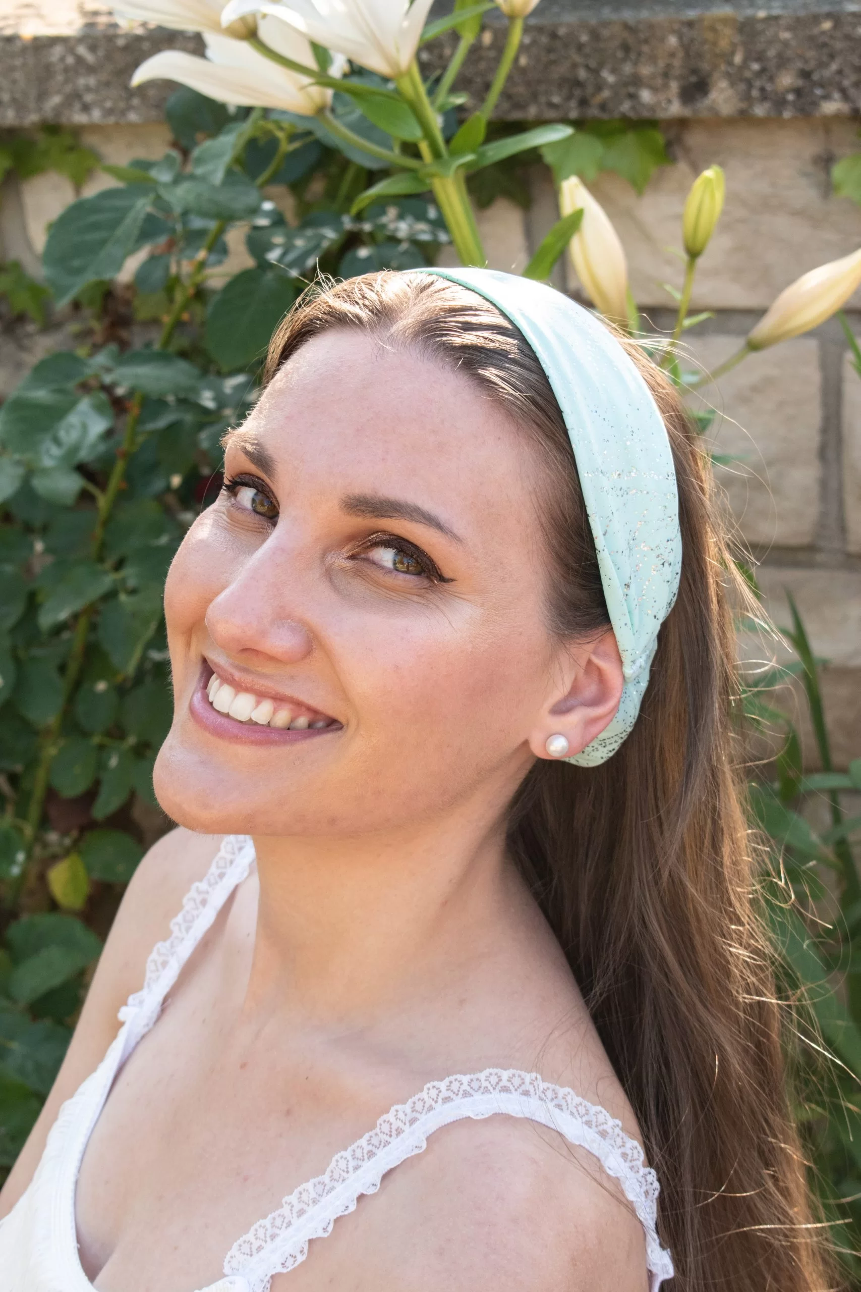 Bandeau pour les cheveux croisé en lycra vert lagon laminé argent