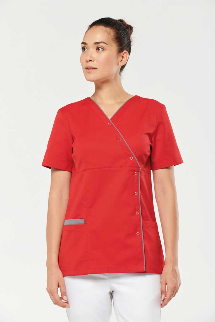 65% polyester / 35% coton. Tissu sergé. Norme ISO 15797 Lavage industriel 75°C (20 lavages). Coupe ajustée grâce à des pinces devant et dos pour une coupe plus féminine. Encolure en V, Boutonnage asymétrique par bouton-pression. 2 poches avant dont une (à droite) à double compartiments (poche intérieure à bord contrasté). Passepoil contrasté à l’encolure et le long de la patte de fermeture. Etiquette nom à l’intérieur du vêtement. Etiquette de marque Tear Away.
