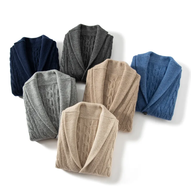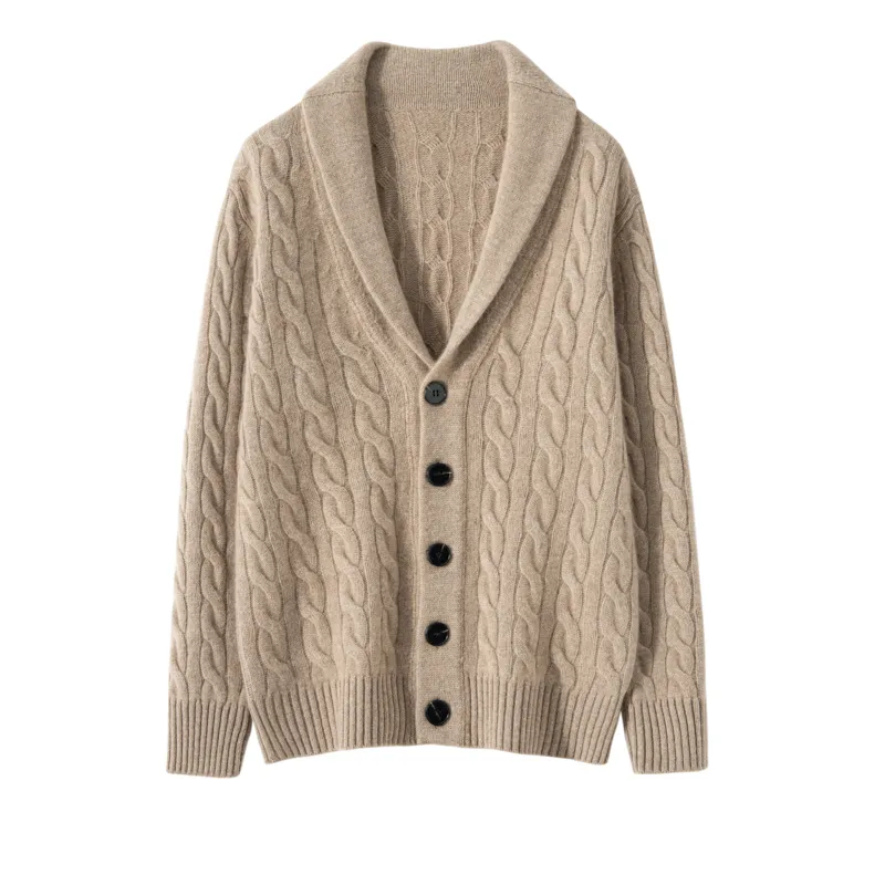 A shawl-collar cardigan in a cashmere, combining comfort with classic style .And it takes sophisticated twisted pattern. Ribbed cuffs and hem for subtle texture and structure is unique. Perfect for layering over shirts and T-shirts and pairing with trousers or jeans.