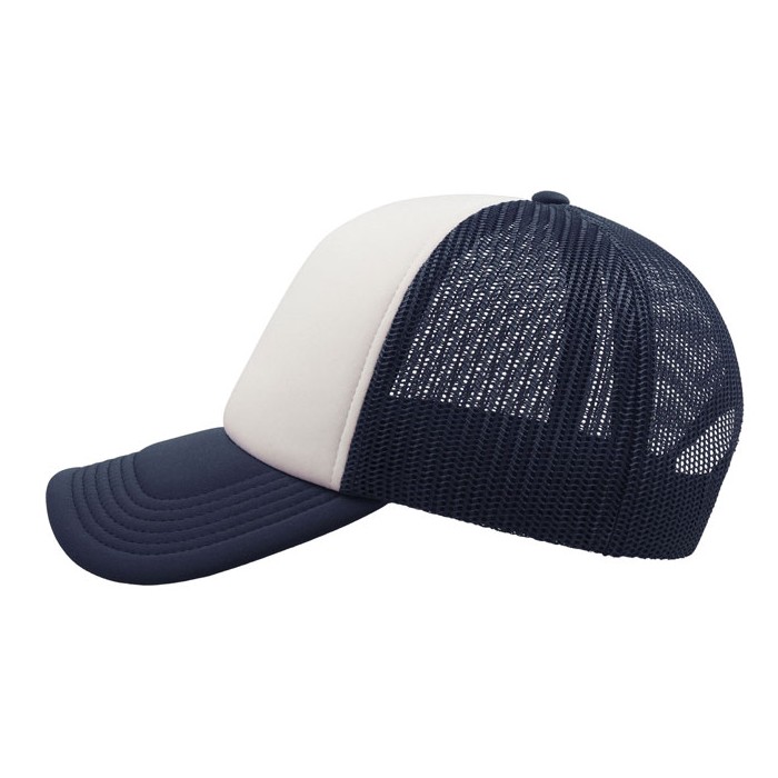Casquette urban trucker 5 panneaux. Panneau et visière en polyester rembourré. Panneaux latéraux et arrière en mesh. Fermeture avec patte de réglage en PVC.