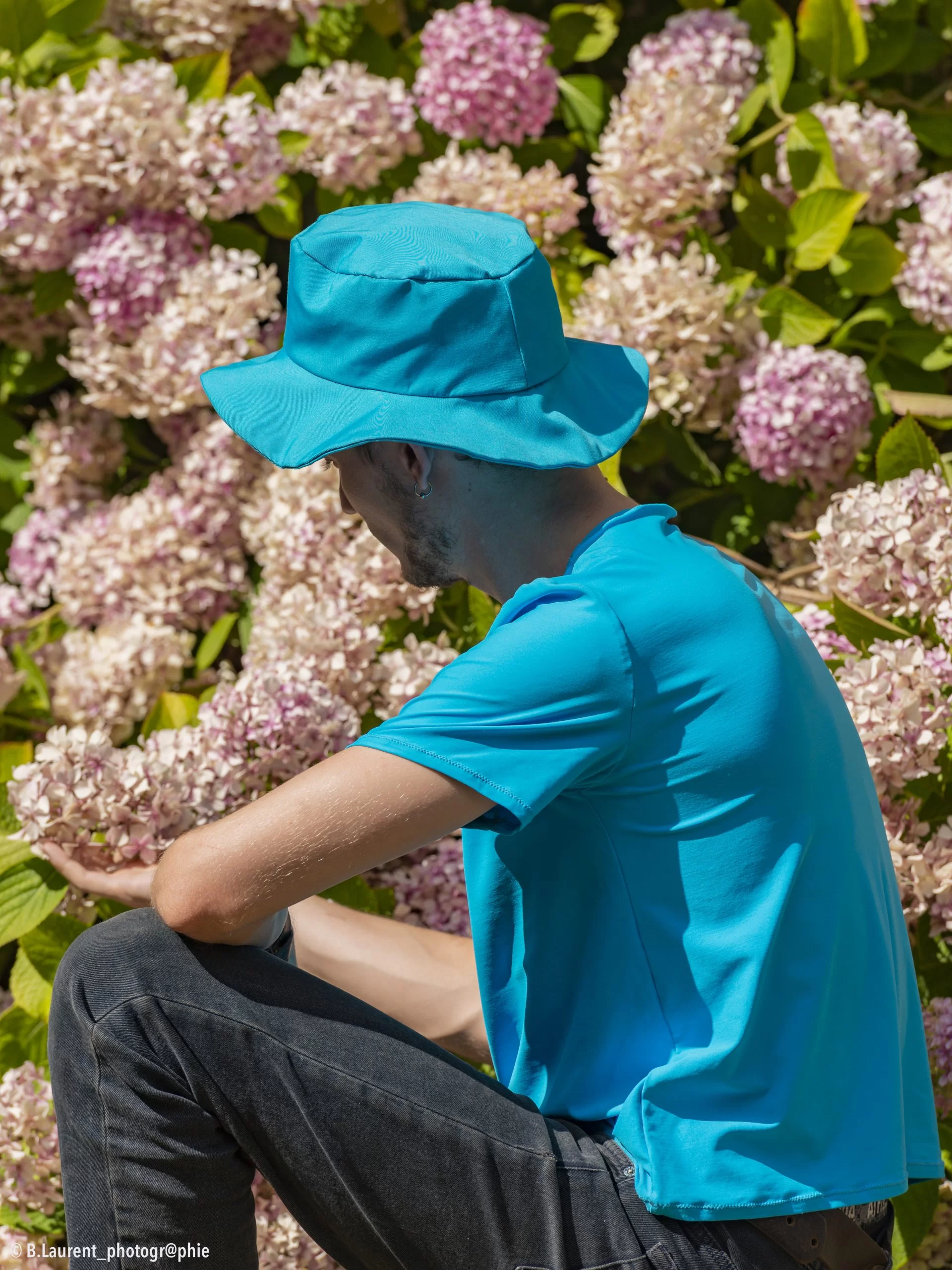 Ce chapeau de soleil Made in France, réalisé à la main en coton turquoise uni vous suivra partout en vacances ! A la plage, à la campagne, à la montagne ou dans votre jardin, votre chapeau préféré vous protégera des rayons du soleil : choisissez votre couleur préférée pour l’assortir à vos tenues ! Le turquoise est une couleur indémodable qui ira avec de très nombreuses tenues !
