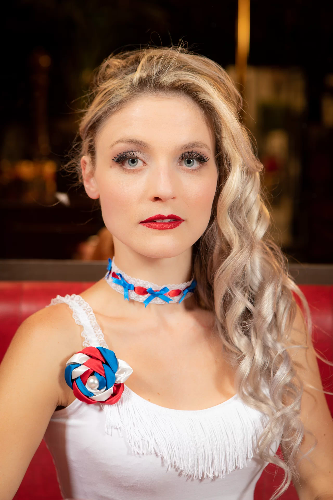 Fan de tricolore ? Nous vous proposons aussi notre débardeur Cocotte bleu blanc rouge, nos fleurs pour cheveux ou broches, (roses, nénuphars…) nos autres chokers…
