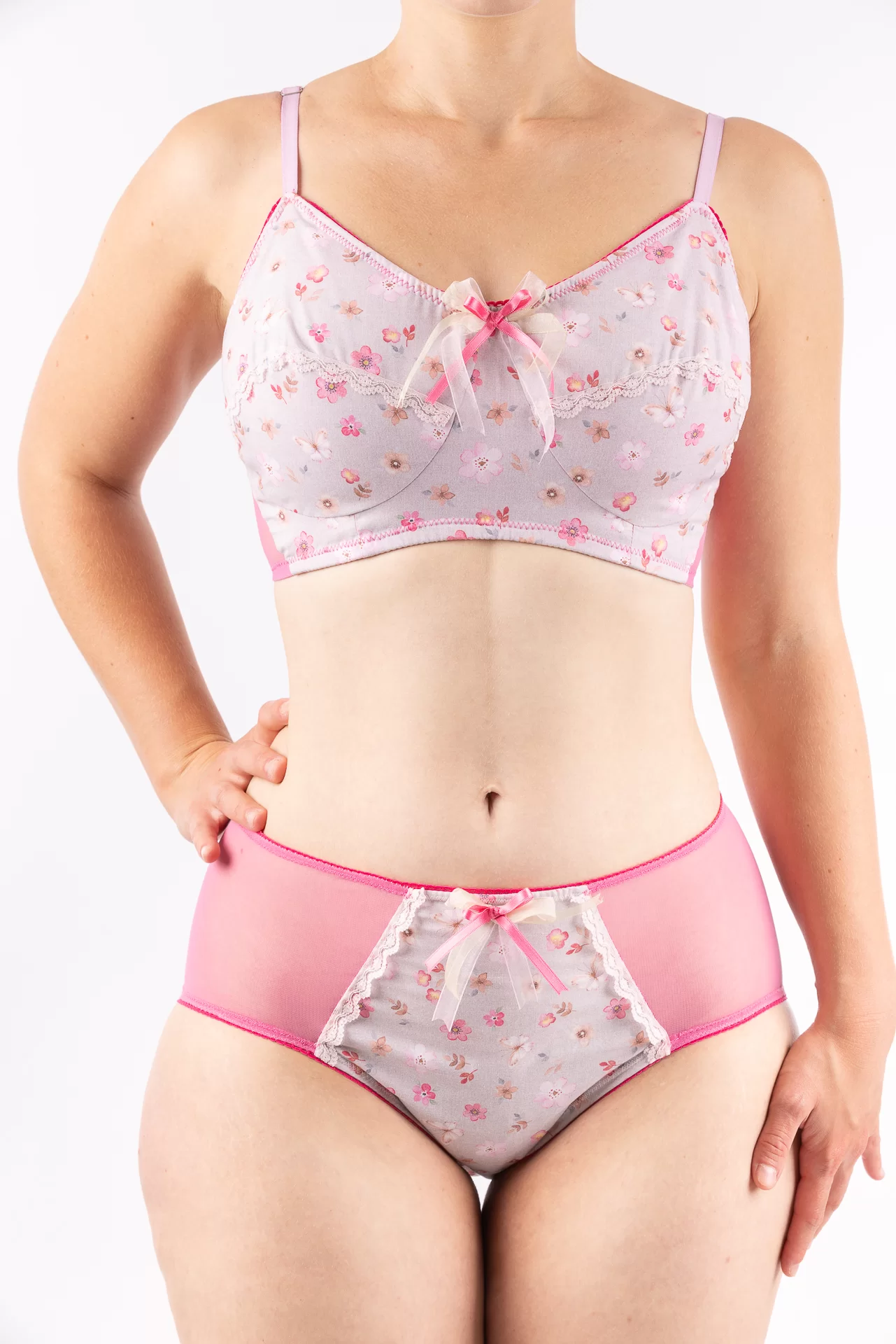 Lookée en toutes situations ! Cette culotte grise et rose en résille nylon/lycra et coton imprimé fleurs et papillons est conçue de manière assortie à nos soutien-gorges de même tissu pour les personnes ayant subi une mastectomie suite à un cancer du sein. Petit noeud de satin rouge milieu devant.