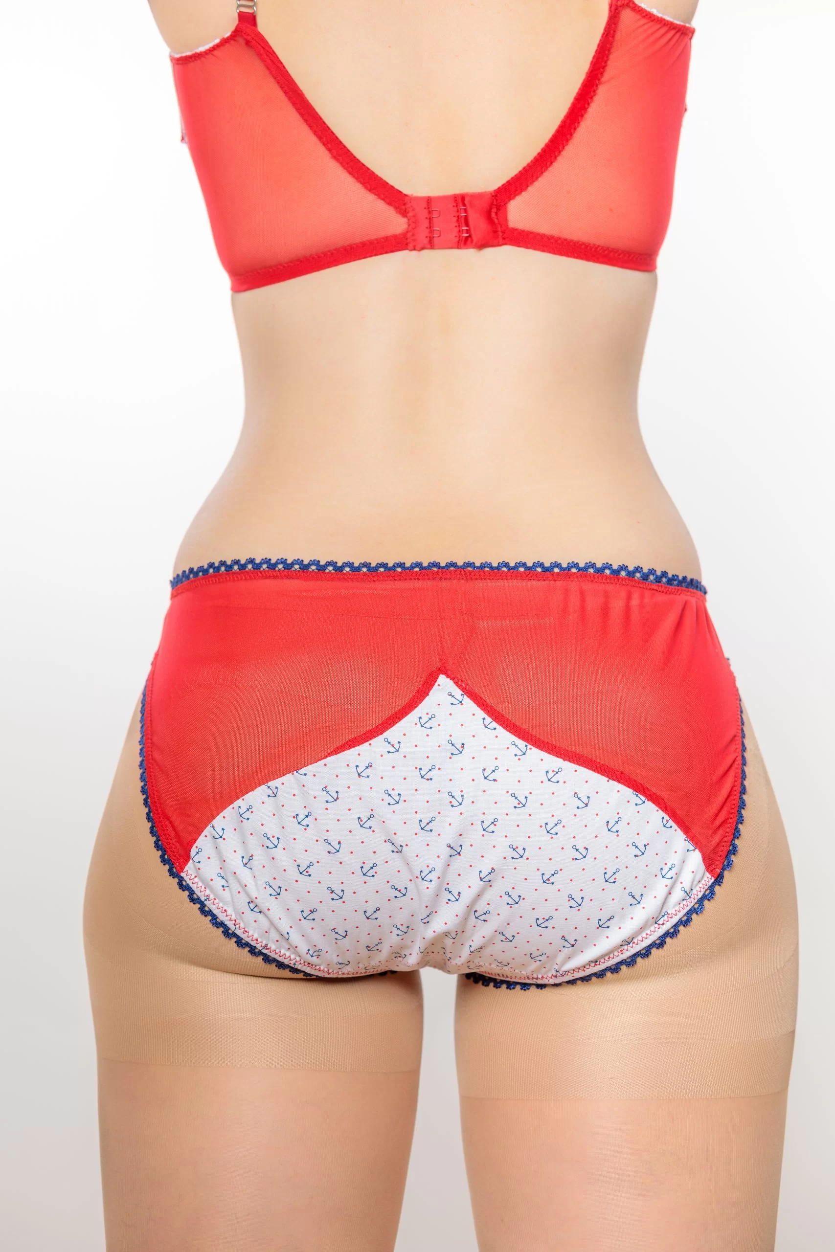 Lookée en toutes situations ! Cette culotte rouge et blanche en résille nylon/lycra et coton imprimé ancres est conçue de manière assortie à nos soutien-gorges de même tissu pour les personnes ayant subi une mastectomie suite à un cancer du sein. Petit noeud de satin rouge milieu devant. L’élastique picot est bleu marine pour rappeler le motif ancres marines de l’imprimé et ainsi ajouter un style supplémentaire à votre culotte !