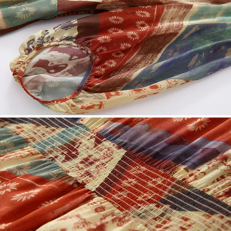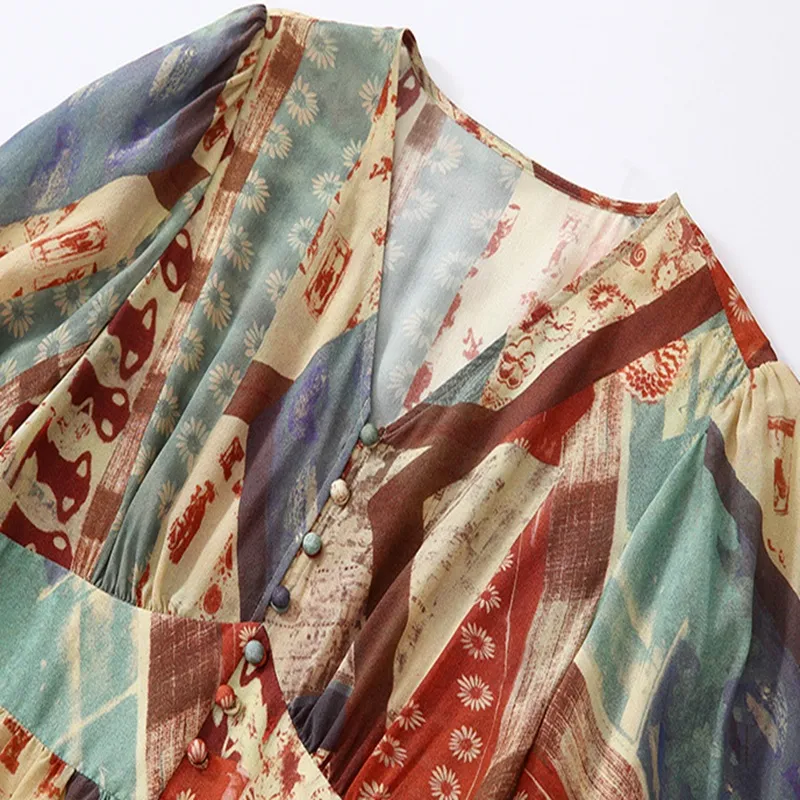 The V-neck and puff sleeves cleverly modify the shoulder and neck lines, adding an elegant touch. The waist-hugging cut of the silk dress and the back waist embroidery not only enhance the beauty of the curves, but also improve the wearing comfort and freedom of movement.