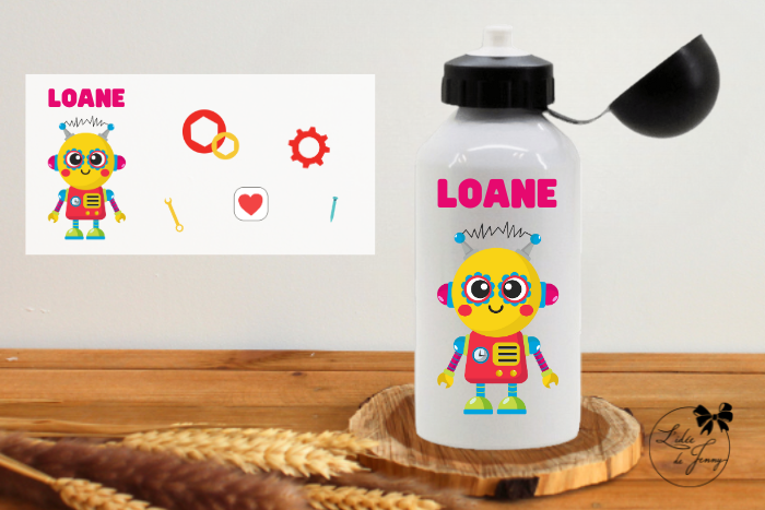 De nombreuses déclinaisons de cette gourde sont disponibles, avec chacune une sélection de motifs différentes tels que des animaux, des sirènes ou des robots, pour accompagner le prénom de votre enfant. Vous pourrez retrouver ces différents modèles dans notre catégorie gourde.