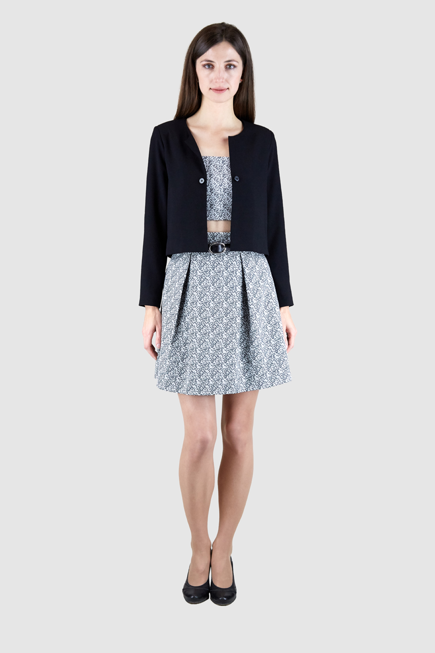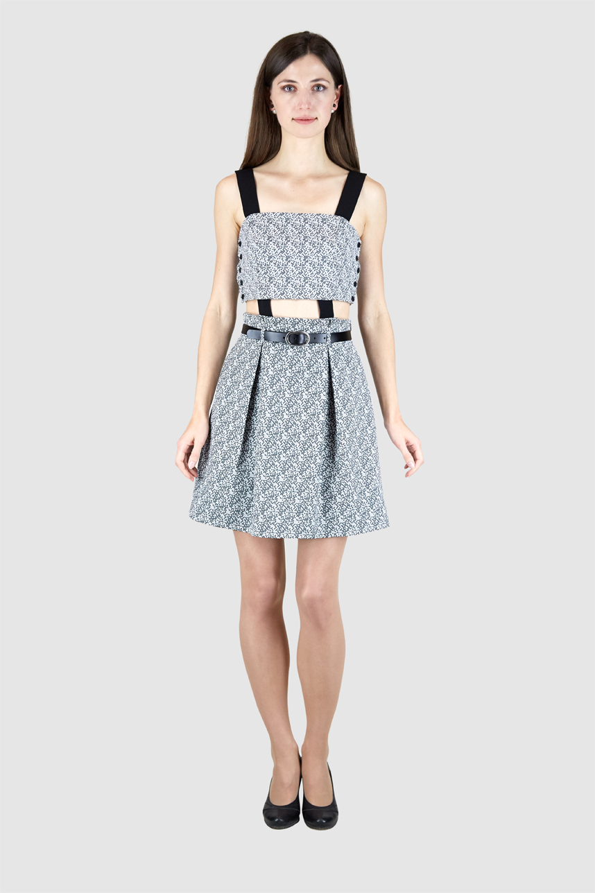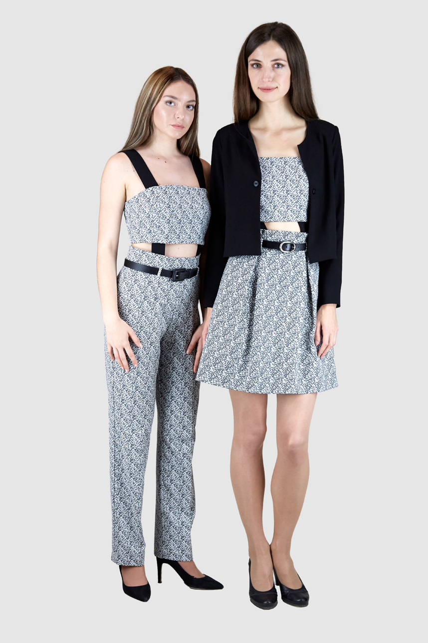Jupe à petits carreaux, noir et blanc modulable grâce à des pattes d’attaches noires amovibles et des boutons intérieurs.
