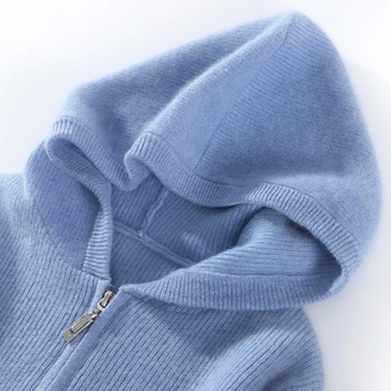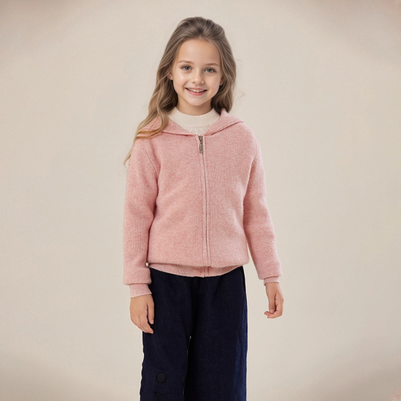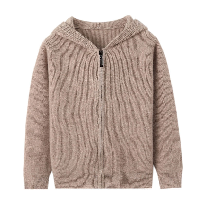 Cozy kids’ cashmere zip hoodie with thick 7-gauge knit, hidden reverse zipper to prevent pinching, hooded design, soft and warm for everyday wear.