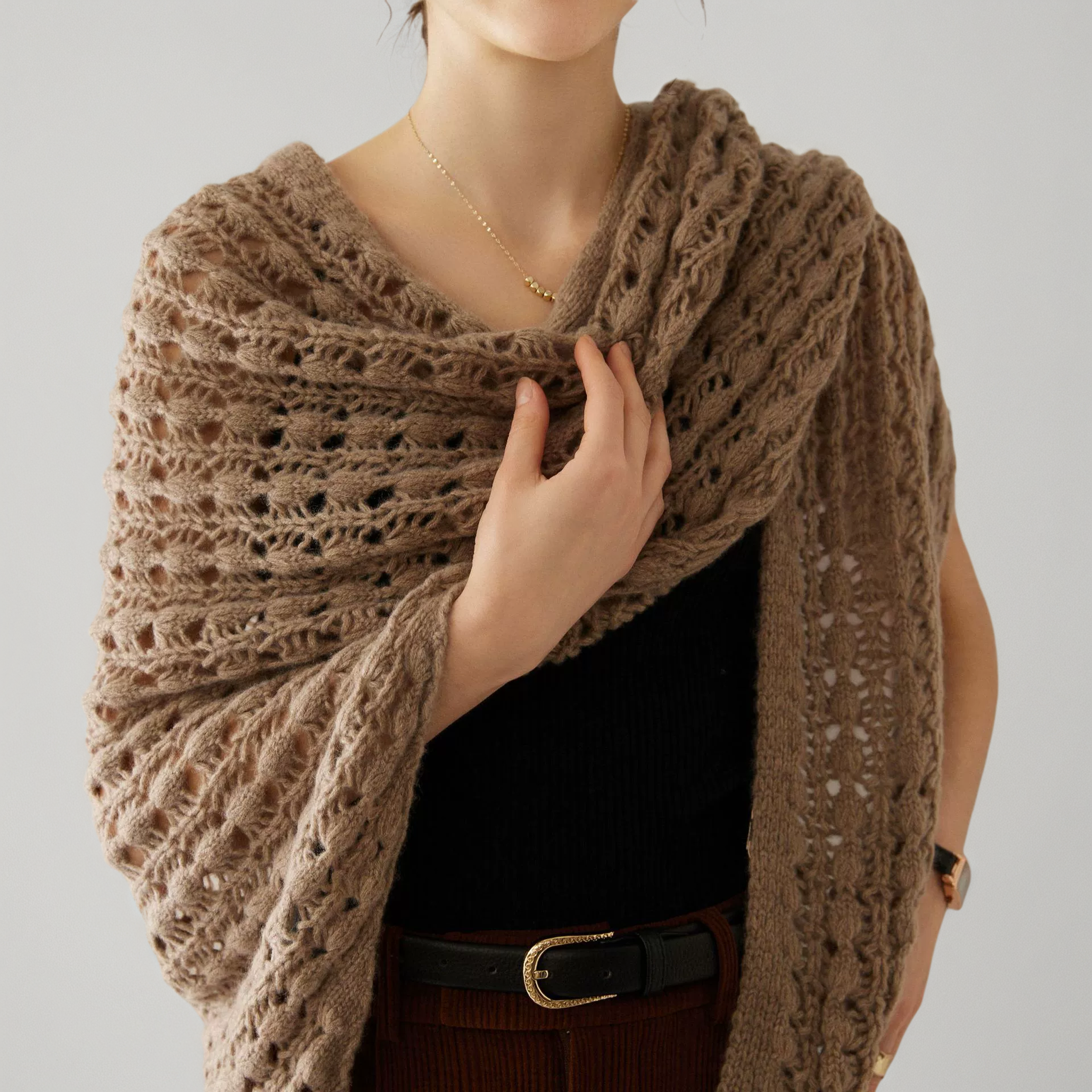 100% pure cashmere knit scarf crafted with thick 3-ply yarn and openwork crochet for a soft, drapey 3D texture. Measuring 260cm* 60cm, this versatile scarf offers multiple styling options, perfect for layering and adding elegance to any outfit.