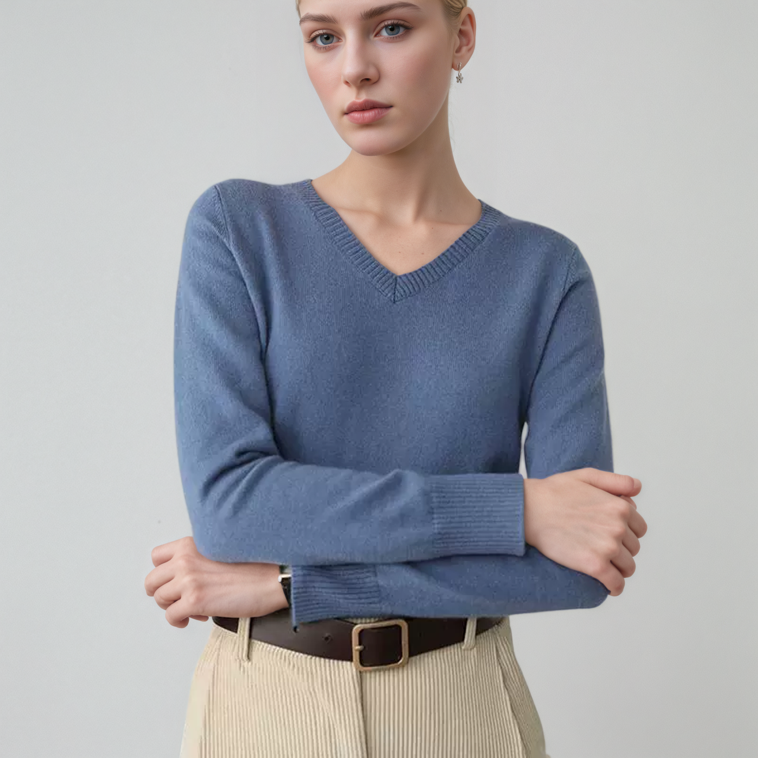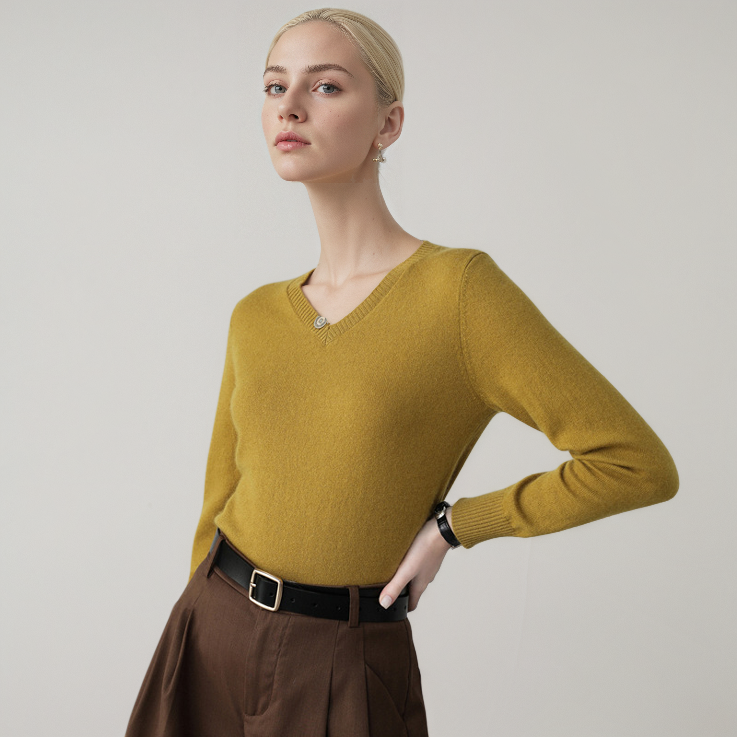 Indulge in luxury with our 4-Color Solid Cashmere V-Neck Lightweight Knit Pullover. Crafted from premium cashmere, this pullover offers unparalleled softness and warmth without bulk, making it an ideal base layer for fall and winter. The classic V-neck flatters your neckline, while refined stitching at the neckline, cuffs, and hem ensures lasting quality. Available in 4 versatile solid colors, it pairs effortlessly with blazers, cardigans, or stands alone for a polished look.