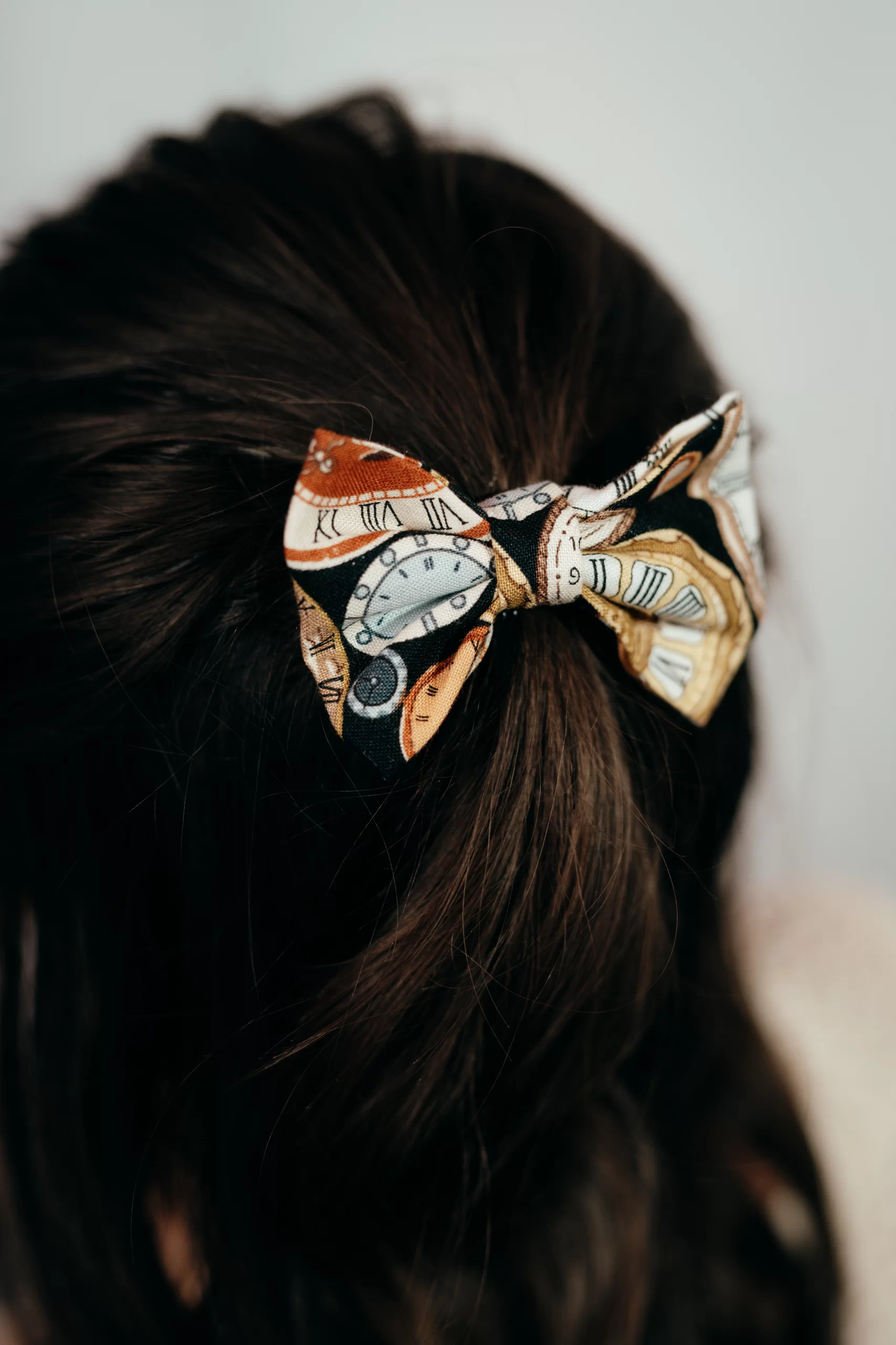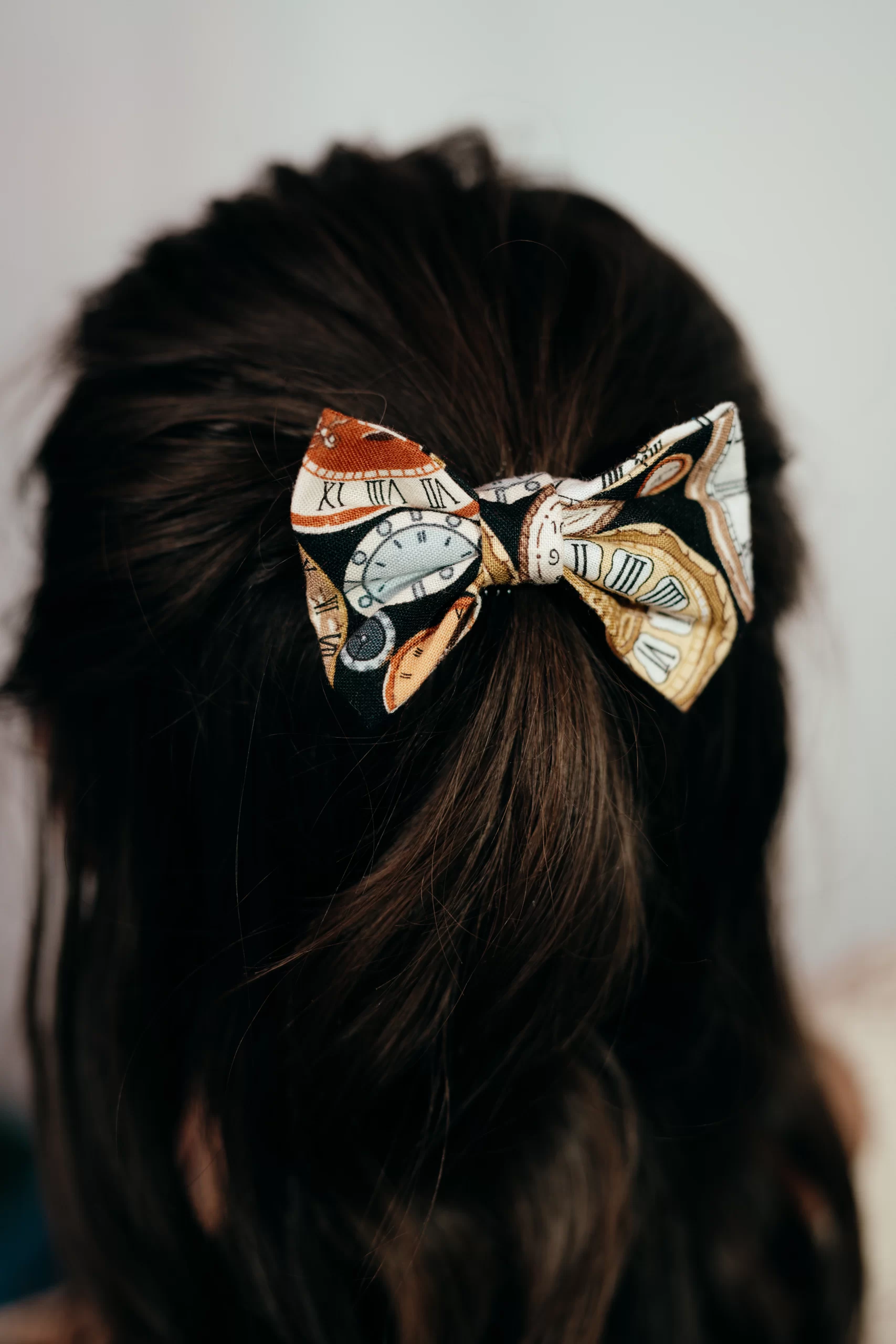 Adorable noeud pour les cheveux en coton noir imprimé montres multicolores : très tendance en ce moment ! Monté sur peigne clip.