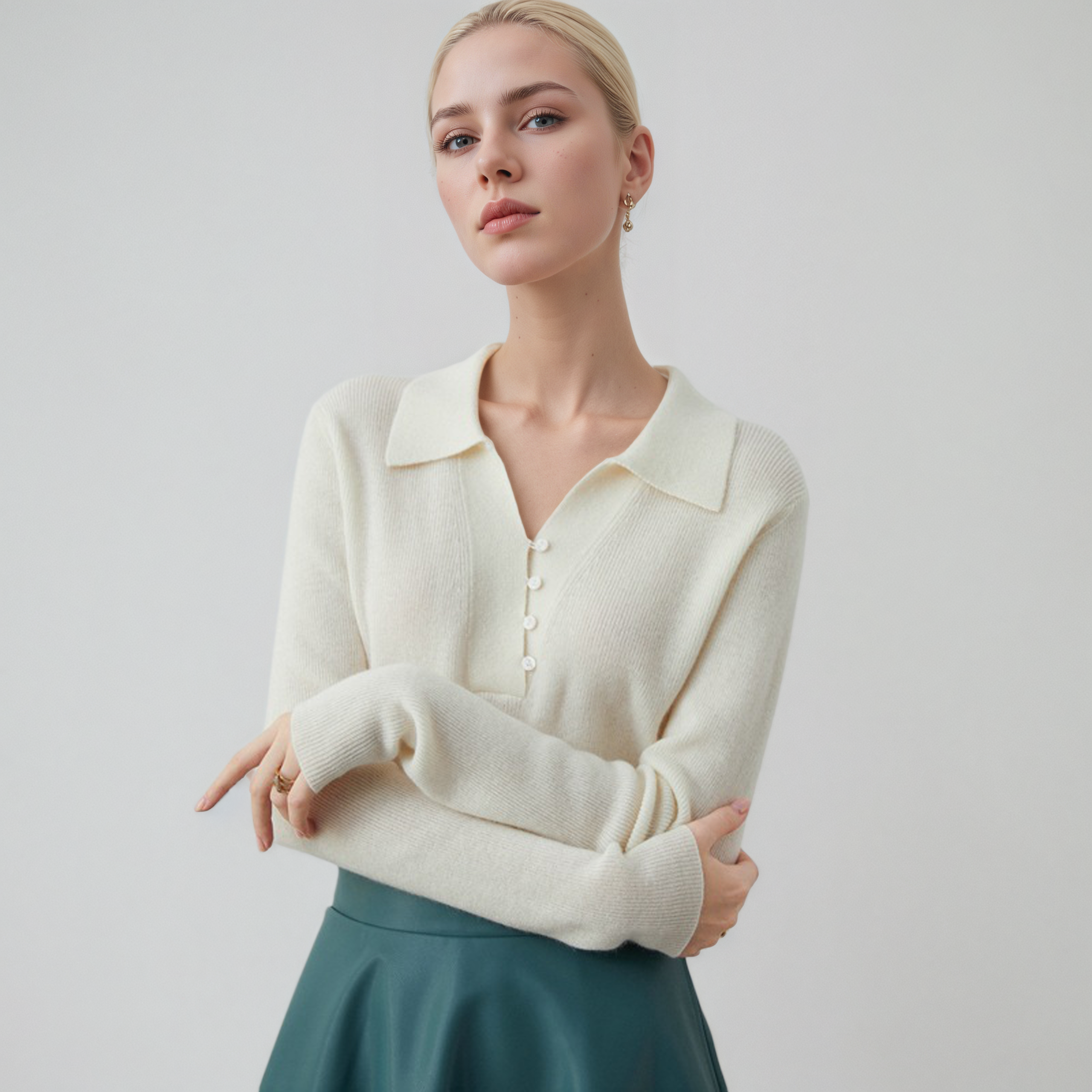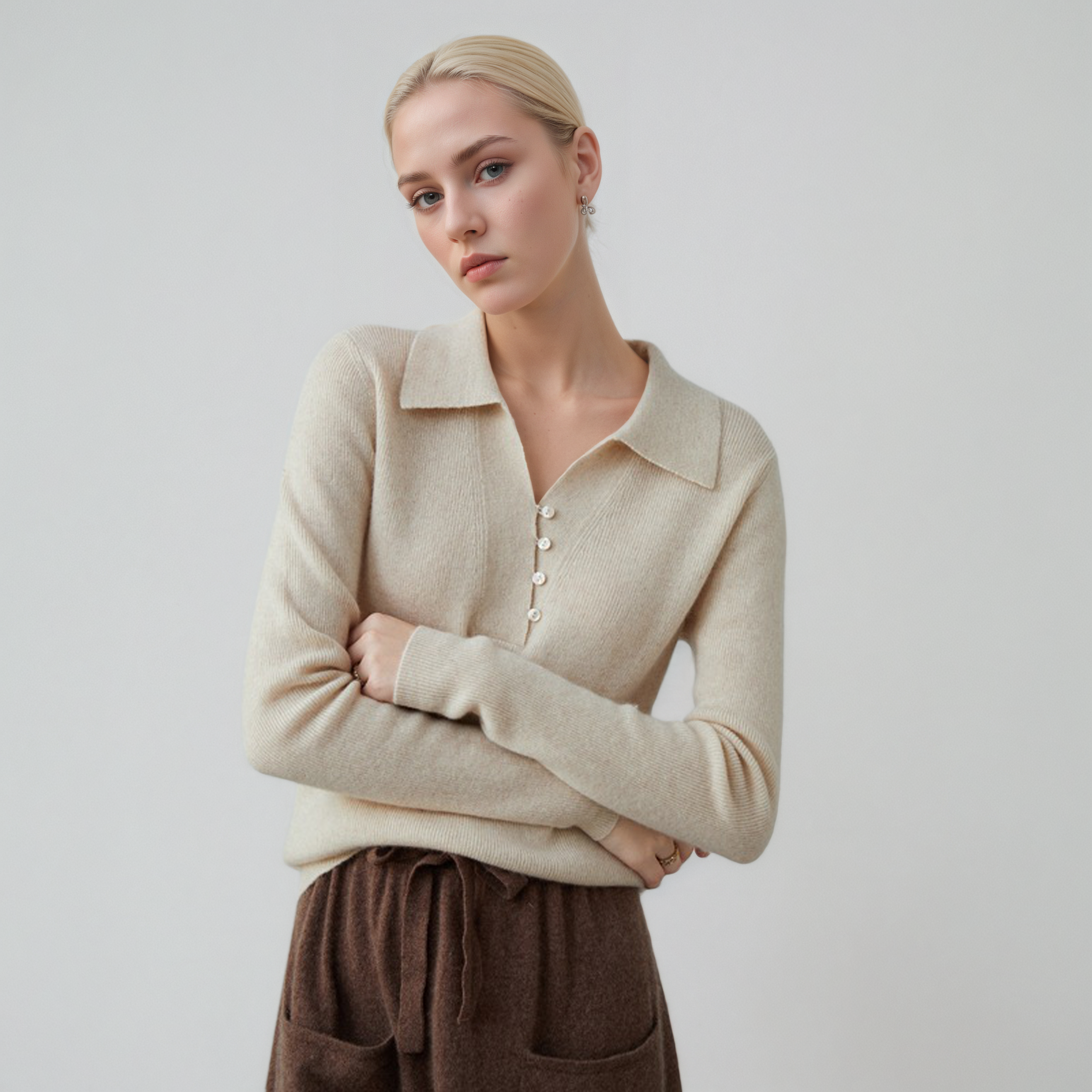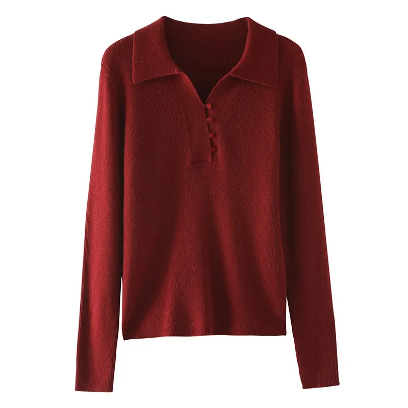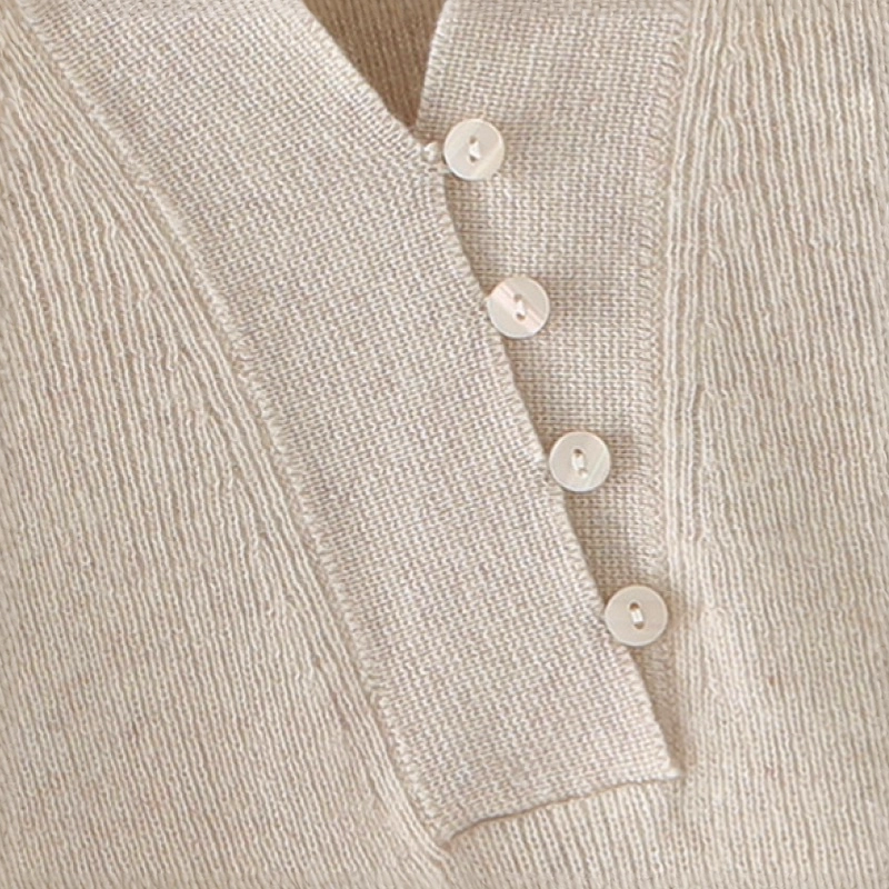 Luxurious women??s cashmere polo V-neck sweater with decorative buttons, knit texture, and a timeless solid color design.