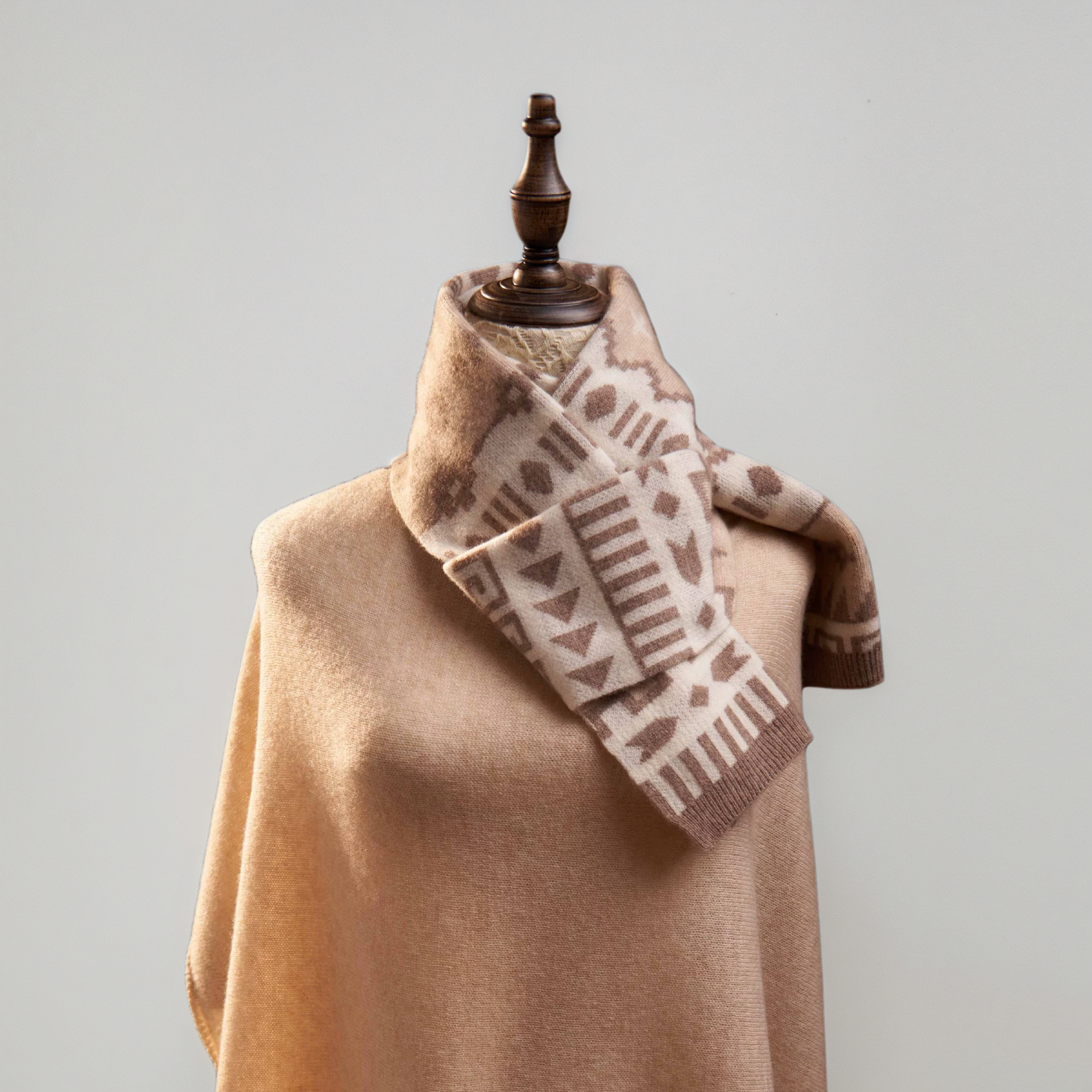 Soft, thick cashmere scarf. Plain weave knit with geometric patterns (triangles, stripes, polka dots). Length 150cm, width 21cm. Can be worn as scarf, neck wrap, or shawl. Cozy and versatile for autumn and winter.