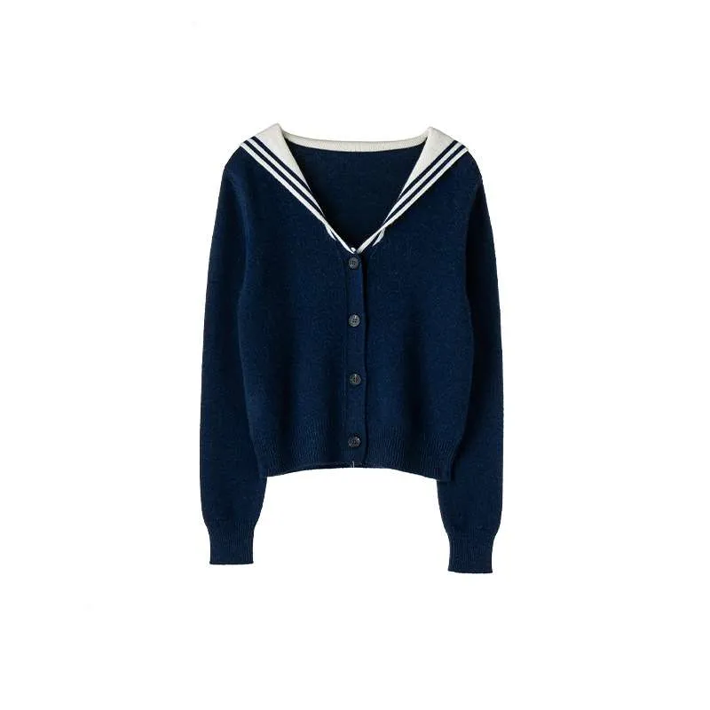 Elegant women’s navy cashmere cardigan with a sailor collar, classic button-up design, and timeless style for versatile wear.