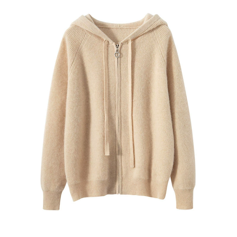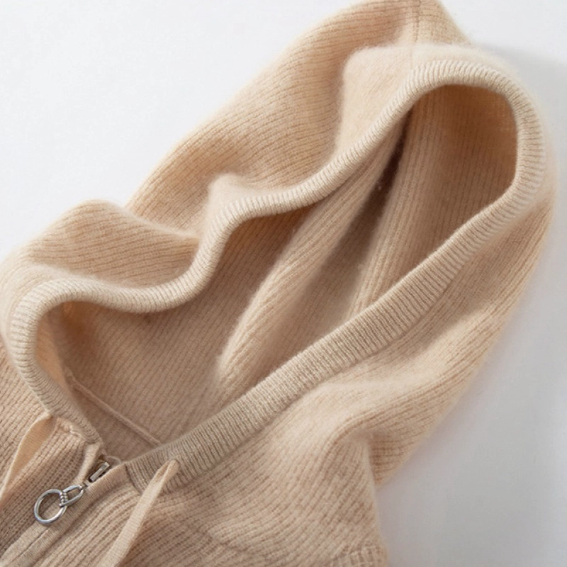 Cashmere zip-up hoodie with raglan sleeves and Ribbed Finish; 12-gauge seed stitch, ~440g