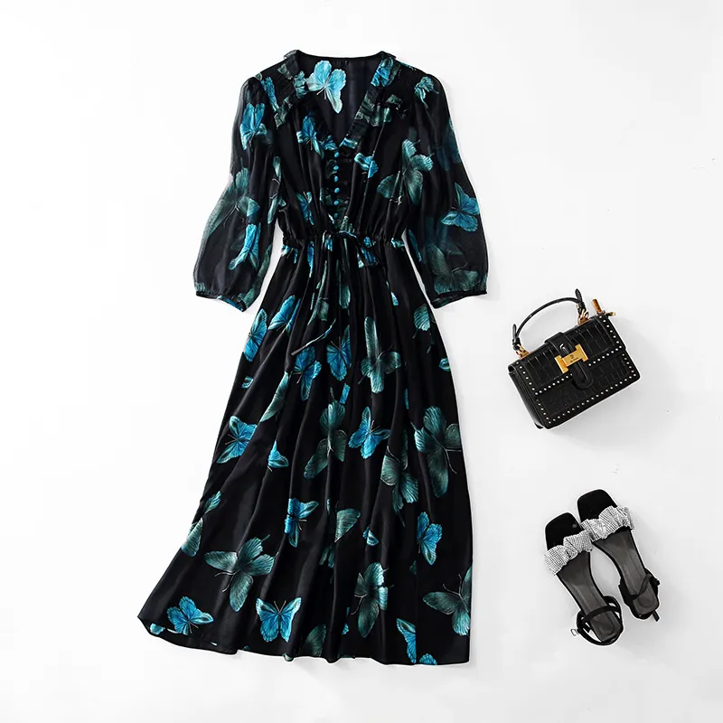 The butterfly print on the whole body of the silk dress is colorful, and the difference in light and dark is designed, with different shades of color, rich three-dimensional layers of the Silk dress. The simple V-neck design and the drawstring design at the waist are tight and stylish, and can be arbitrarily scaled to highlight the figure.