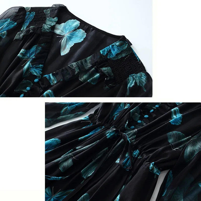 Sheer Sleeves Silk Dress With Blue Butterfly Print