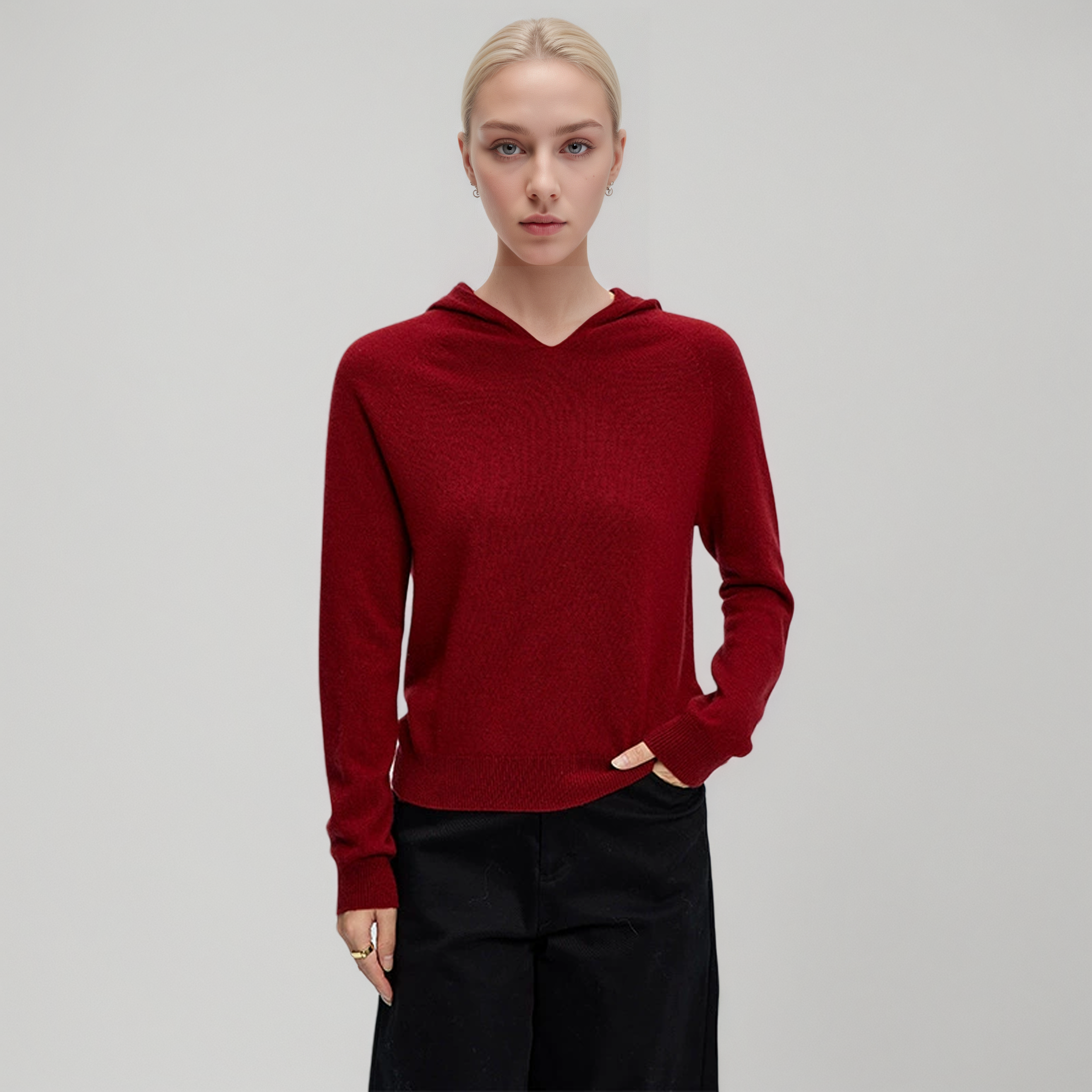 Our Women’s Cashmere V-Neck Hoodie combines the casual comfort of a hoodie with the refined luxury of premium cashmere. Crafted in a seamless knit construction, it offers a smooth, tailored fit without bulky stitches. The V-neckline adds a feminine touch, while the raglan sleeves provide ease of movement and a sporty edge. Ribbed hem and cuffs ensure durability and a clean finish. Perfect for layering or wearing on its own, this cashmere hoodie is a versatile wardrobe essential that blends everyday comfort with elevated style.