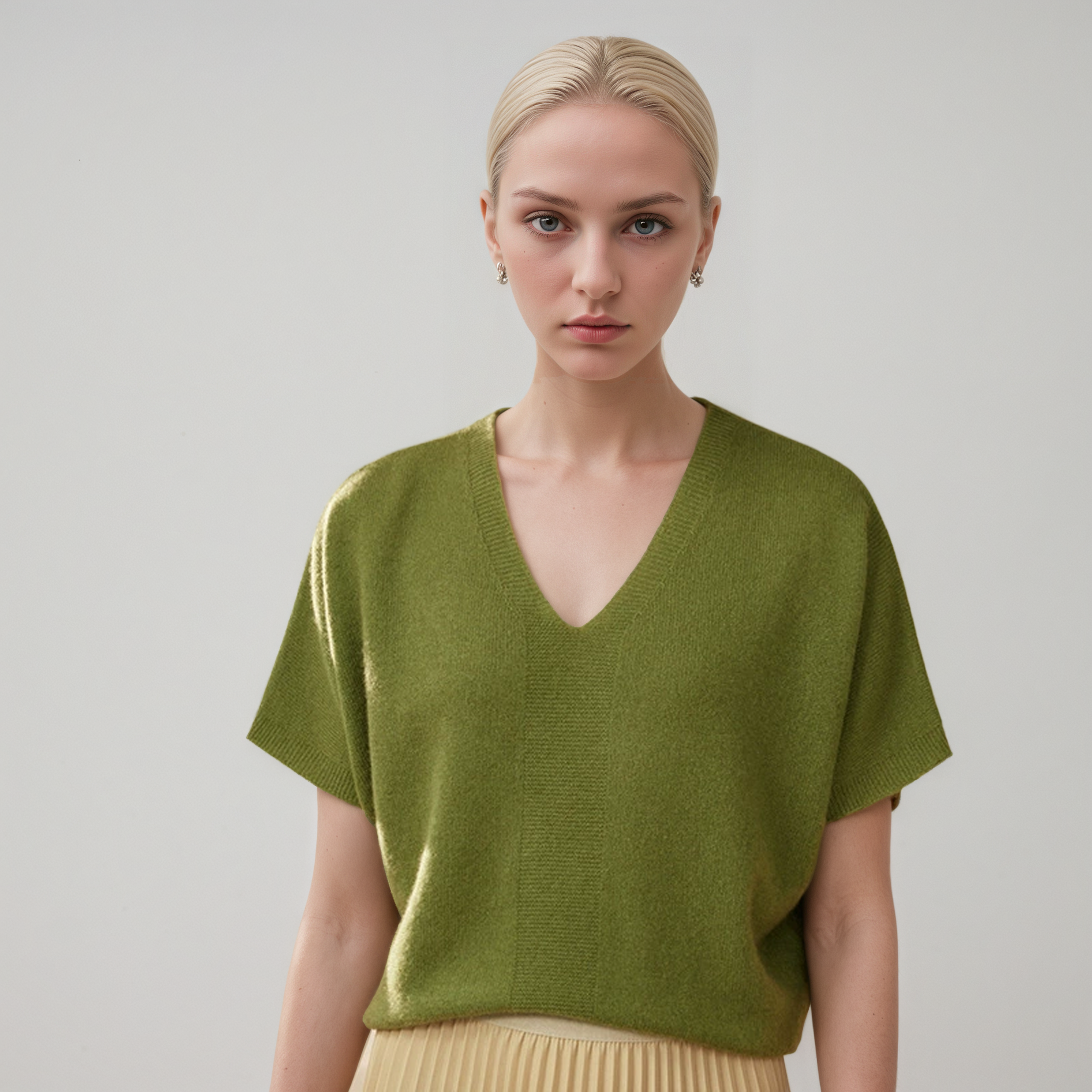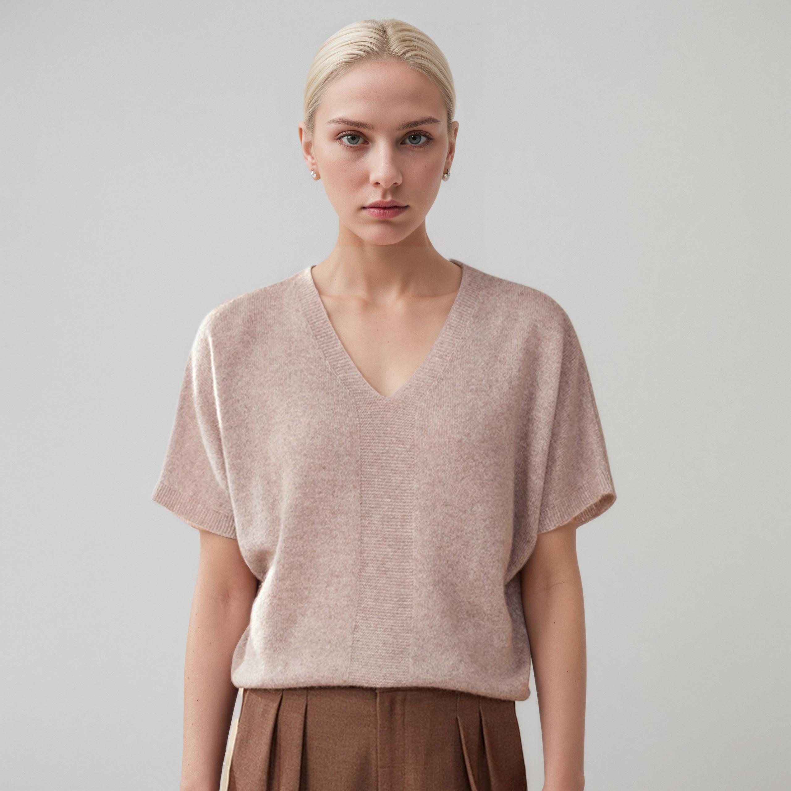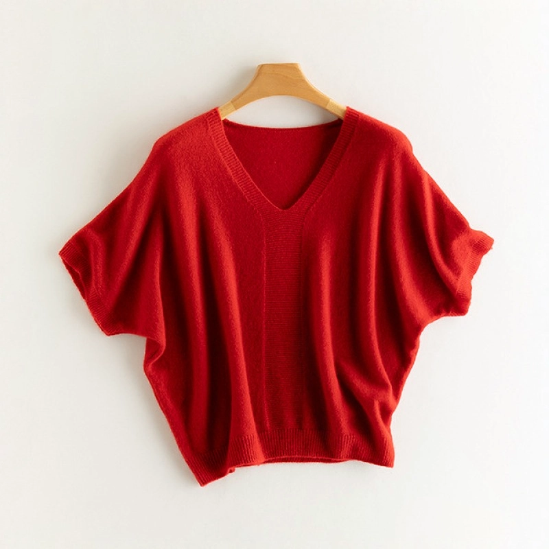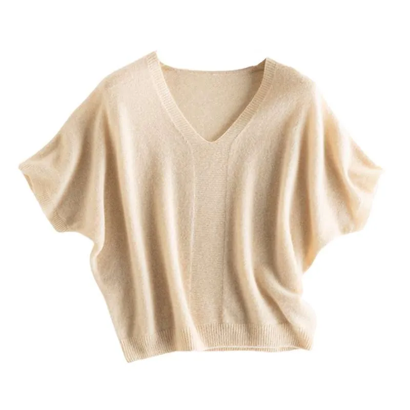 Women’s thin V-neck short-sleeve cashmere sweater, batwing sleeves, horizontal chest knit texture, ribbed edges, loose fit, 4 colors.