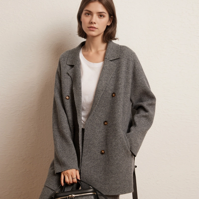 Engineered from 12-gauge air-layer cashmere with a total weight of approximately 710g, this women’s blazer coat delivers lightweight warmth and a sophisticated appearance. Features include a notched lapel, double-breasted front, and hidden side pockets, while the relaxed mid-length silhouette allows for easy layering over sweaters or dresses. Perfect for both professional and casual settings.