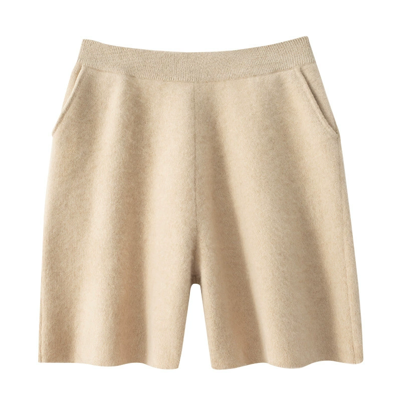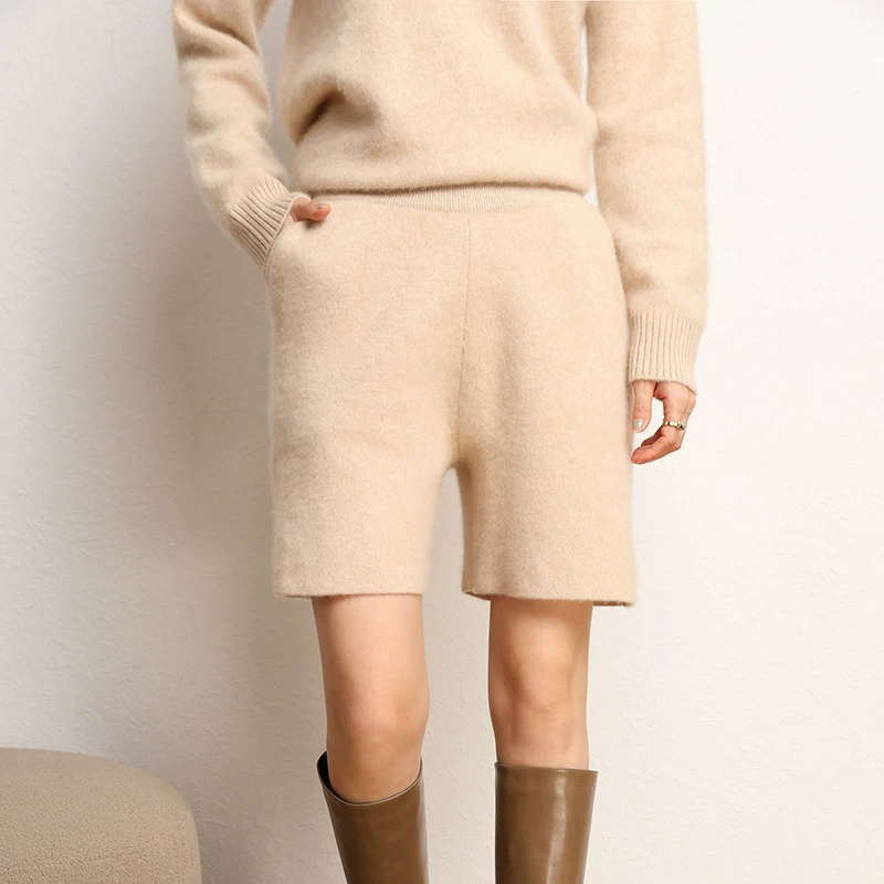 Women’s 12-gauge thick cashmere high-waist shorts with elastic waistband, side invisible slant pockets, and speckled texture for cozy, high-stretch comfort.