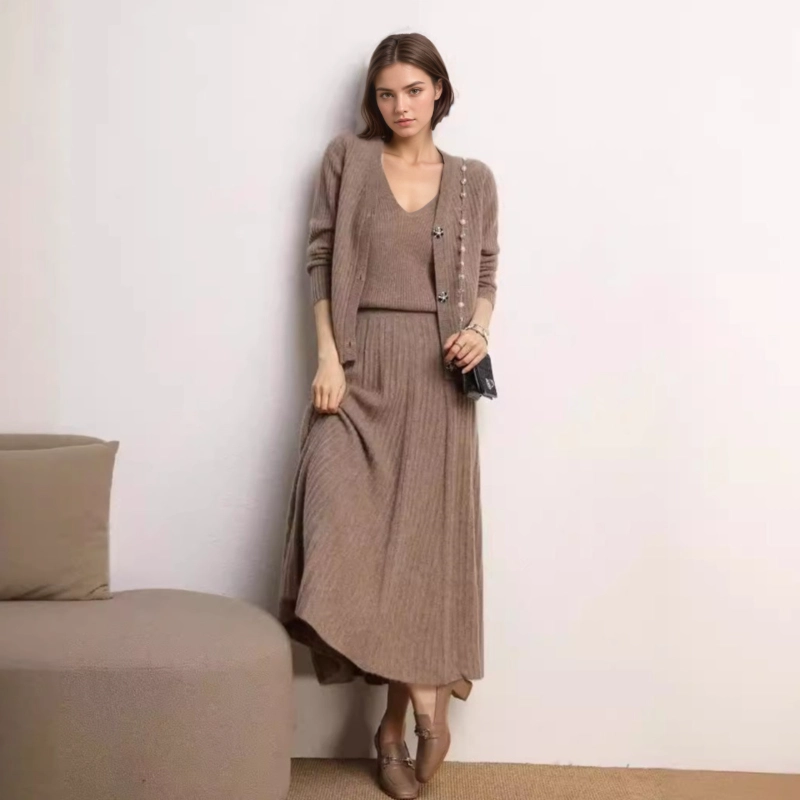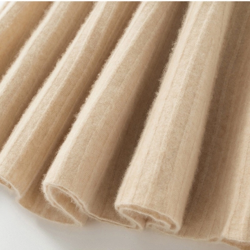 Made from 100% premium cashmere, this A-line knit skirt combines a high-elastic waistband with pleated flared hem for a flattering silhouette. The vertical ribbed texture enhances structure while maintaining soft stretch and comfort. Mid-length design makes it versatile for casual, office, or refined weekend styling. Approx. weight: 400g.