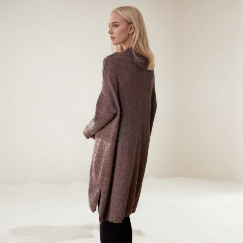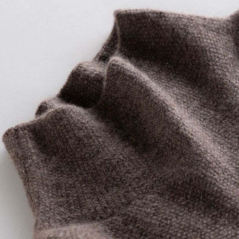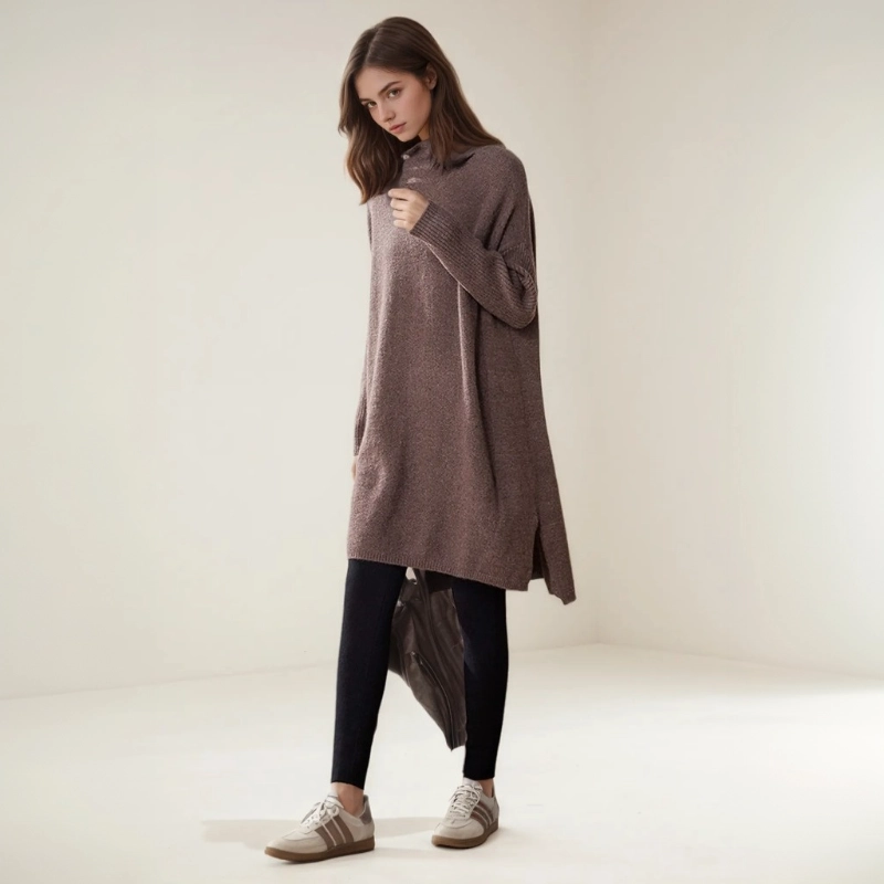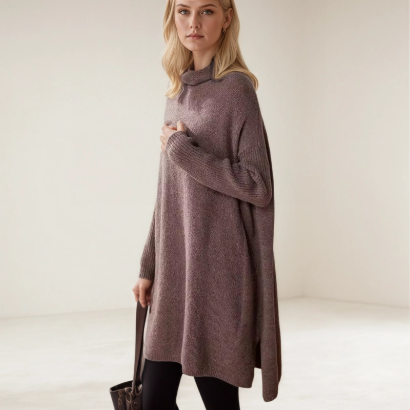 This elegant turtleneck midi dress is made from soft cashmere, featuring side slits and vertical ribbed texture on the sleeves. Perfect for layering or wearing alone, it’s crafted from 7-gauge, 26S double-ply wool for a luxurious feel.