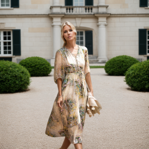 Button Collar V-neck Silk Dress Beige