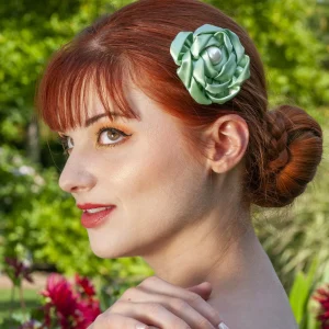 Accessoire cheveux Haute Couture fleur en satin vert Camélia