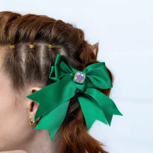 Accessoire cheveux noeud à pans en satin vert avec cabochon central Libellule