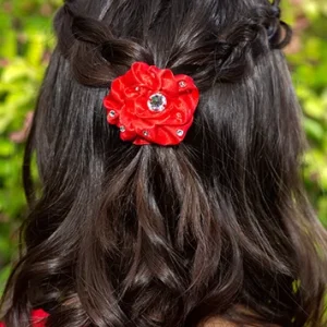 Accessoire cheveux fleur rouge Haute Couture en satin uni à strass cristal argent